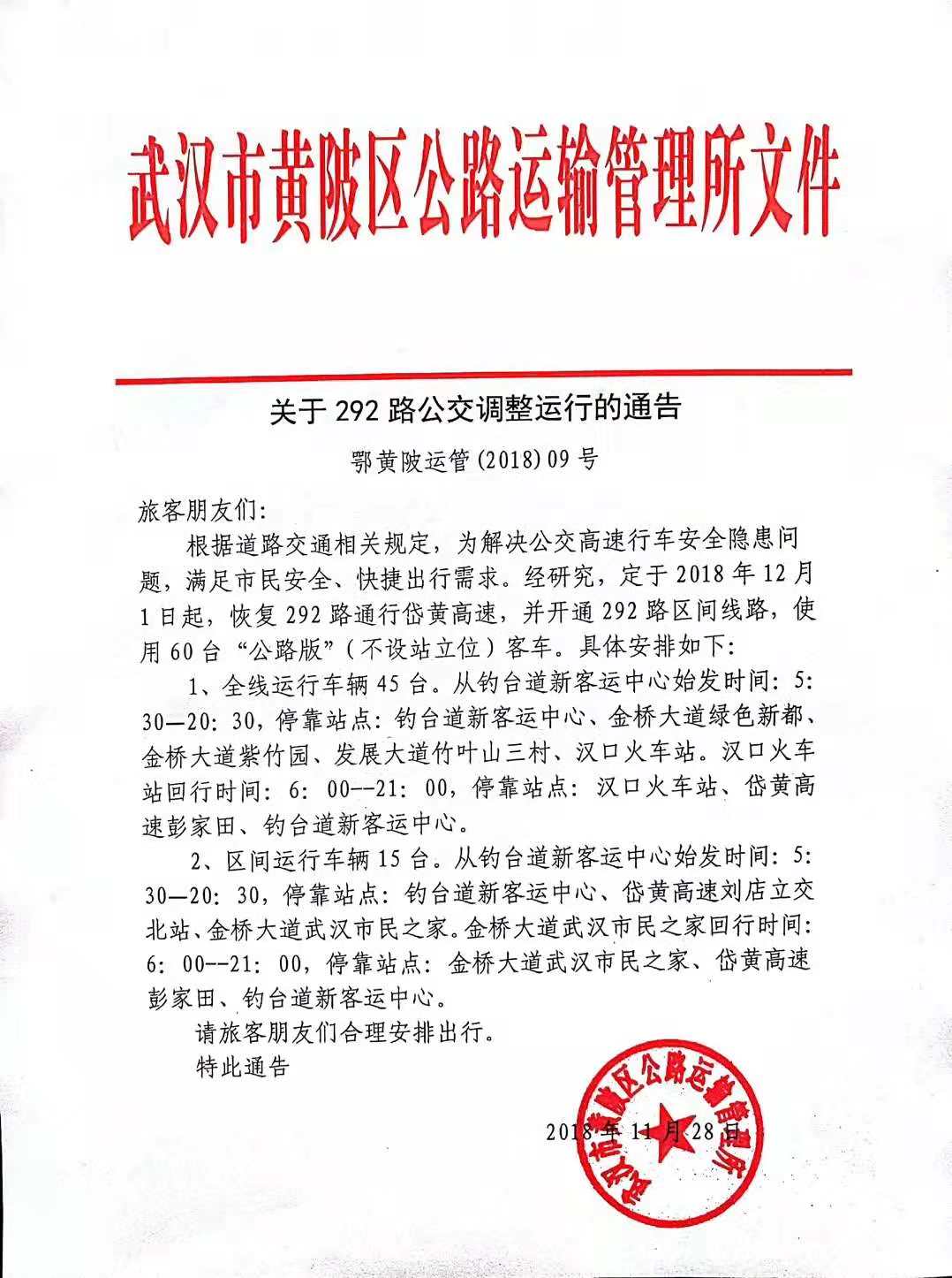 關(guān)于292路公交調(diào)整運(yùn)行的通告