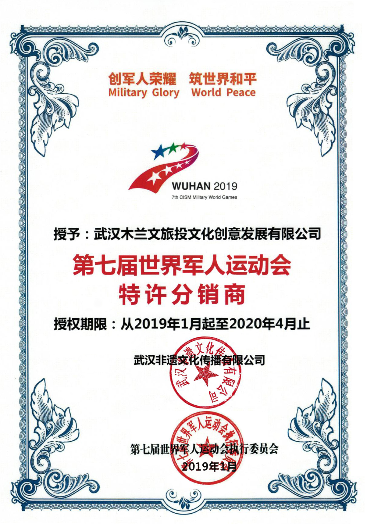 軍運會是世界盛會,更是黃陂幸事,自以軍運會吉祥物兵兵為主題的官方特許商品研發(fā)以來,武漢木蘭文旅投文化創(chuàng)意發(fā)展有限公司極度關(guān)注,并積極參與,在黃陂區(qū)委區(qū)政府和黃陂區(qū)軍運會籌委會的大力支持下,憑借自身實力和優(yōu)勢,于2019年元月份被第七屆世界軍人運動會執(zhí)行委員會授予黃陂地區(qū)第七屆世界軍人運動會特許分銷商,為黃陂區(qū)助力軍運,宣傳軍運及木蘭文化與軍運精神融合宣傳建立了更廣泛的營銷渠道。